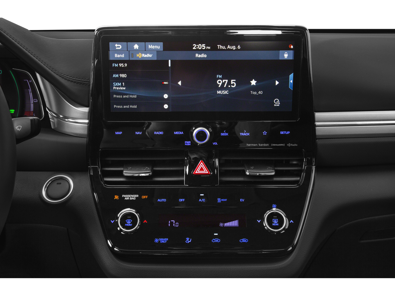 - Radio: AM/FM Premium Display Audio -inc: harman/kardon audio, 8 speakers, 10.25" high resolution touchscreen display, navigation, rearview camera w/dynamic guidance, USB input jacks, Android Auto and Apple CarPlay integration for compatible smartphones, integrated Bluetooth® hands-free phone system w/phonebook transfer, SiriusXM satellite radio w/90-day trial (not available in AK and HI), HD Radio technology, USB charge port in center console, Blue Link connected car services, Blue Link connected care and remote package (for 3-years, enrollment required), wireless device charging for compatible smartphones, Clari-Fi music restoration technology and Blue Link guidance package (for 3-years, enrollment required)