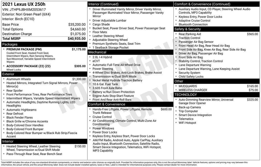 Nori Green Pearl 250h Base AWD CVT 2.0L 16V DOHC Sunroof / Moonroof, Back Up Camera, Bluetooth®, Leather Seat Trim, Alloy Wheels, Audio Controls on the Steering Wheel, Blind Zone Monitoring, Cruise Control, Dual Climate Control, Power Liftgate, Premium Heated Leather Seats, Proximity Keyless Entry, Push Button Start, Rear Parking Sensors, Rear View Camera, Satellite Radio, Side Air Bags, 2.0L 16V DOHC, 4-Wheel Disc Brakes, 6 Speakers, Apple CarPlay/Android Auto, Auto High-beam Headlights, Automatic temperature control, CD player, Delay-off headlights, Driver door bin, Dual front impact airbags, Emergency communication system: Enform Safety Connect (complimentary 3-year subscription), Exterior Parking Camera Rear, Four wheel independent suspension, Front anti-roll bar, Front dual zone A/C, Heated & Ventilated Front Seats, Intuitive Parking Assist, Low tire pressure warning, Luxury NuLuxe Seat Trim, NuLuxe Seat Trim, Occupant sensing airbag, Power door mirrors, Power driver seat, Power passenger seat, Power Tilt & Slide Moonroof, Power windows, Premium Package, Radio data system, Radio: Lexus Multimedia System w/Color Display, Rain Sensor Windshield Wipers, Rear anti-roll bar, Rear reading lights, Rear window defroster, Speed-sensing steering, Split folding rear seat, Spoiler, Steering wheel mounted audio controls, Telescoping steering wheel, Turn signal indicator mirrors, Washi Instrument Panel, Wheels: 18 x 7J 5-Spk Dark Gray Met Alum Alloy.