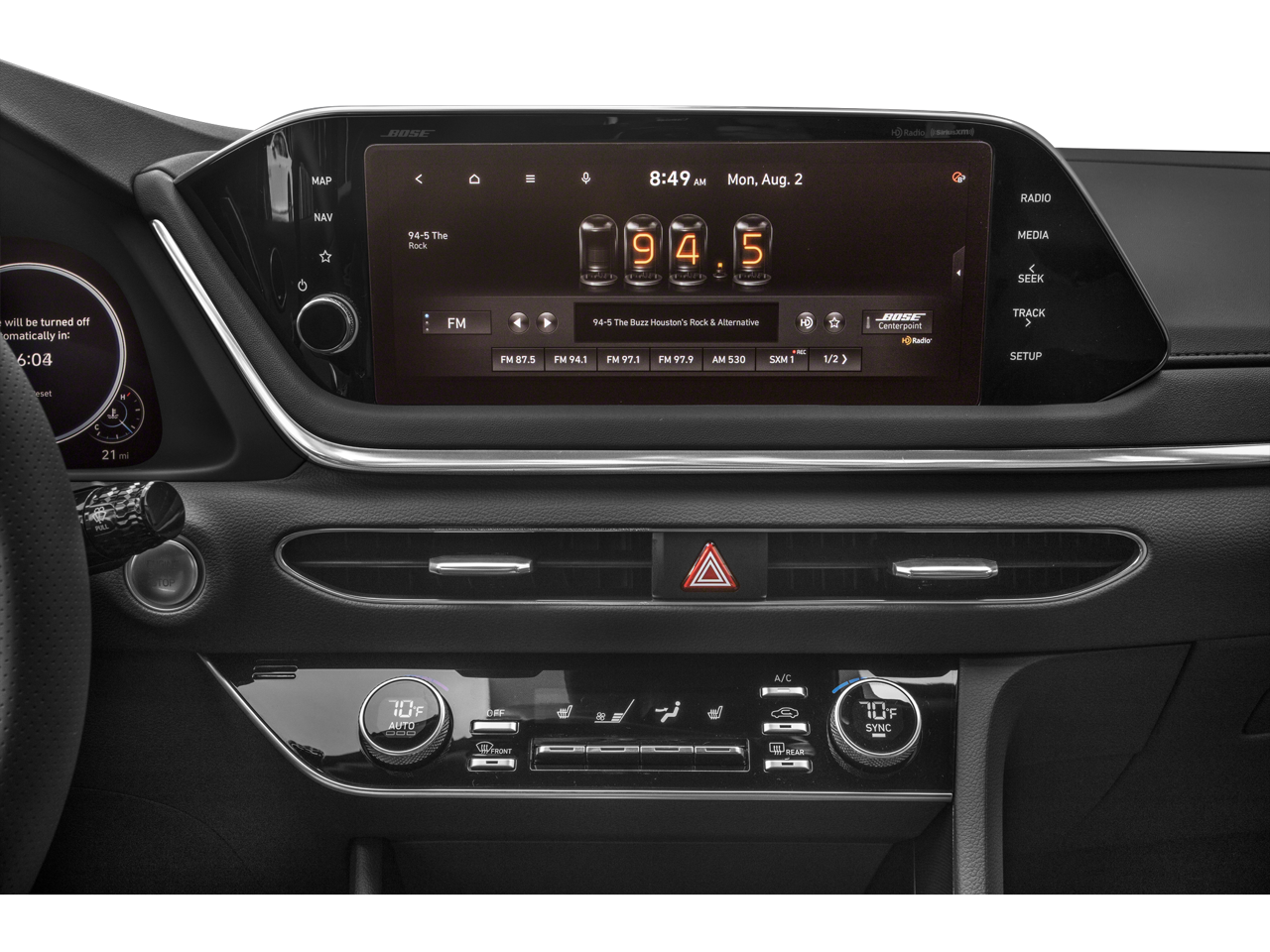 - Radio: AM/FM/MP3/HD/SiriusXM Display Audio w/Nav -inc: 10.25" color touchscreen, Bose premium audio w/12 speakers (1 center channel, 2 dash, 2 front tweeters, 4 door mounted, 2 rear mounted speakers plus 1 rear mounted subwoofer), dynamic voice recognition, integrated Bluetooth®, Blue Link connected car system, Apple CarPlay, Android Auto, USB, diversity antenna for navigation and HERE HD traffic