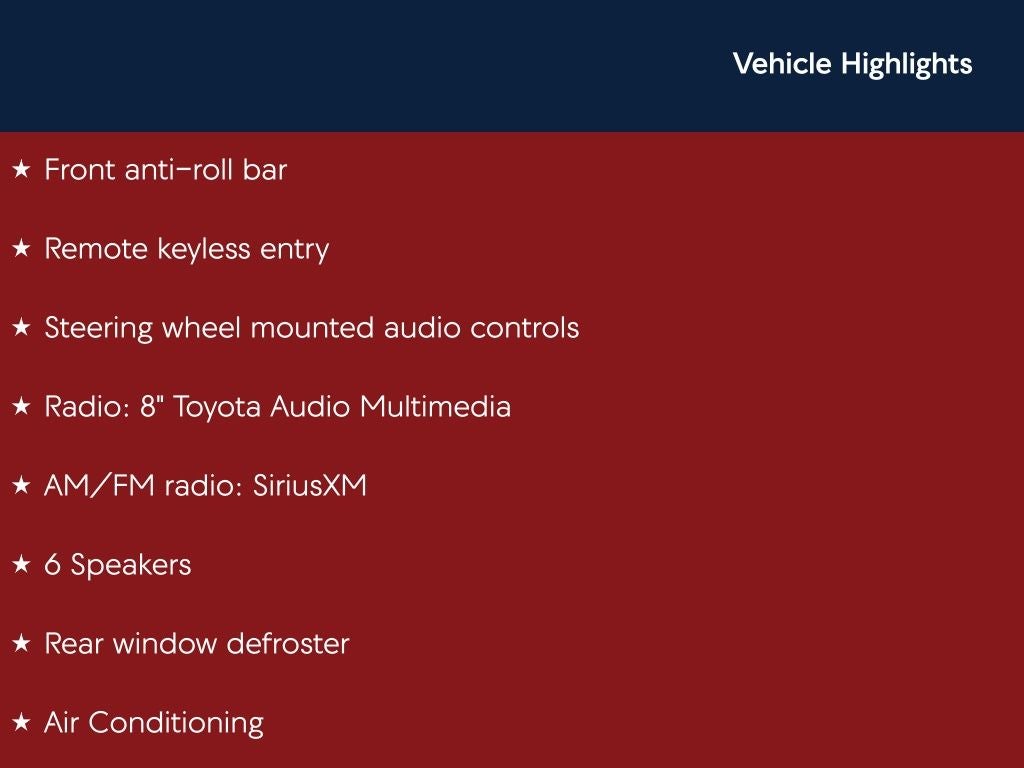 Ice Cap LE FWD CVT 2.0L I4 DOHC 16V Back Up Camera, Bluetooth®, Clean History Report, a Clean Carfax, 4-Wheel Disc Brakes, 6 Speakers, ABS brakes, Air Conditioning, AM/FM radio: SiriusXM, Apple CarPlay/Android Auto, Auto High-beam Headlights, Automatic temperature control, Brake assist, Dual front impact airbags, Dual front side impact airbags, Electronic Stability Control, Emergency communication system: Safety Connect (up to 10-year trial subscription), Exterior Parking Camera Rear, Front anti-roll bar, Front Center Armrest, Front wheel independent suspension, Fully automatic headlights, Knee airbag, Low tire pressure warning, Occupant sensing airbag, Overhead airbag, Panic alarm, Passenger door bin, Power door mirrors, Radio: 8 Toyota Audio Multimedia, Rear anti-roll bar, Rear side impact airbag, Rear window defroster, Remote keyless entry, Speed control, Split folding rear seat, Steering wheel mounted audio controls, Telescoping steering wheel, Tilt steering wheel, Traction control, Wheels: 16 Steel with Covers.