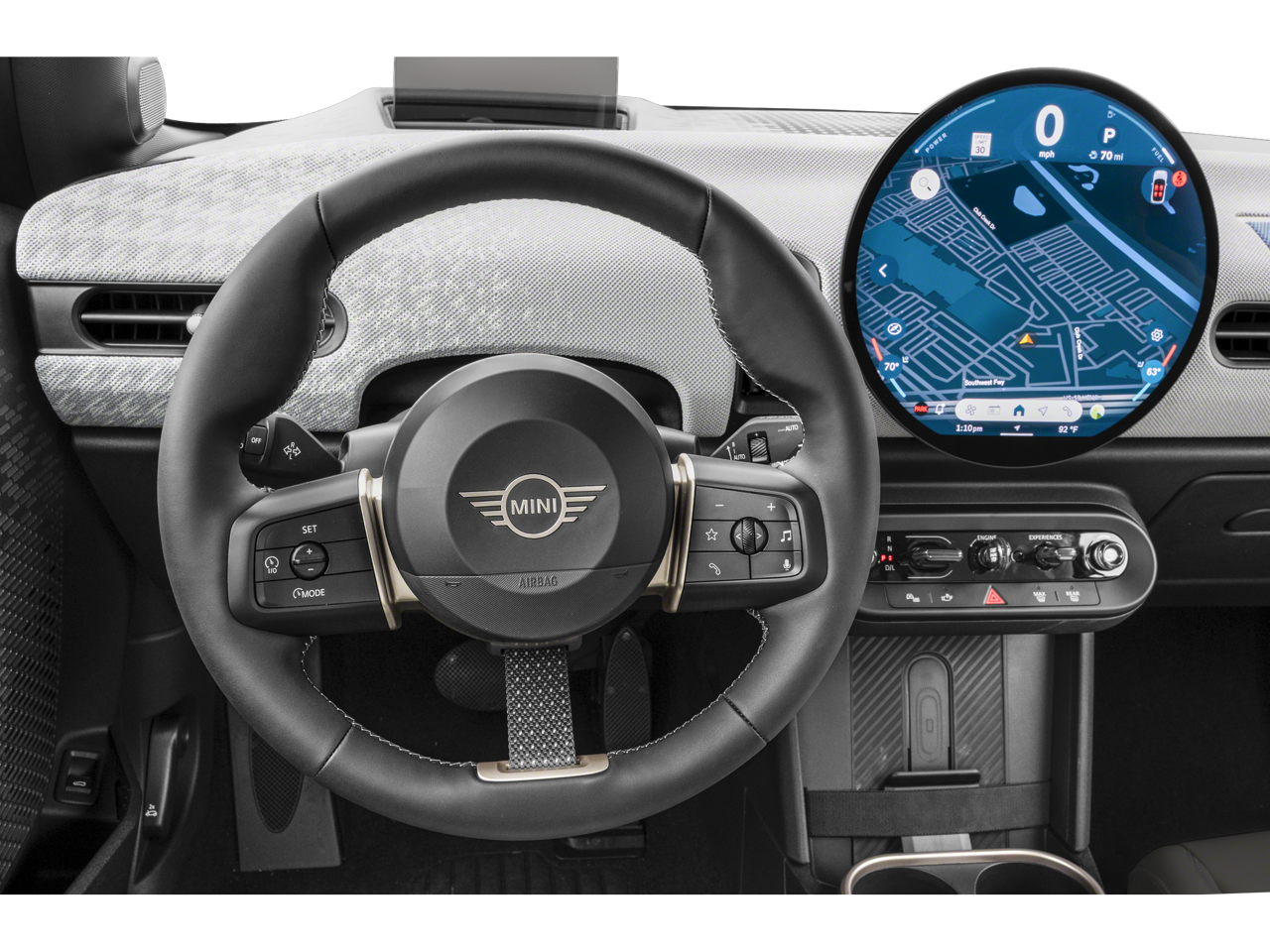 Step inside the spacious cabin and you'll be greeted by the high-quality Vescin/Cloth upholstery, Heated Front Seats, and the advanced MINI Interaction Unit, which seamlessly integrates your smartphone and provides intuitive access to navigation, entertainment, and vehicle settings. The MINI Head-Up Display and MINI Assist eCall further enhance the driving experience, keeping you informed and connected at all times.